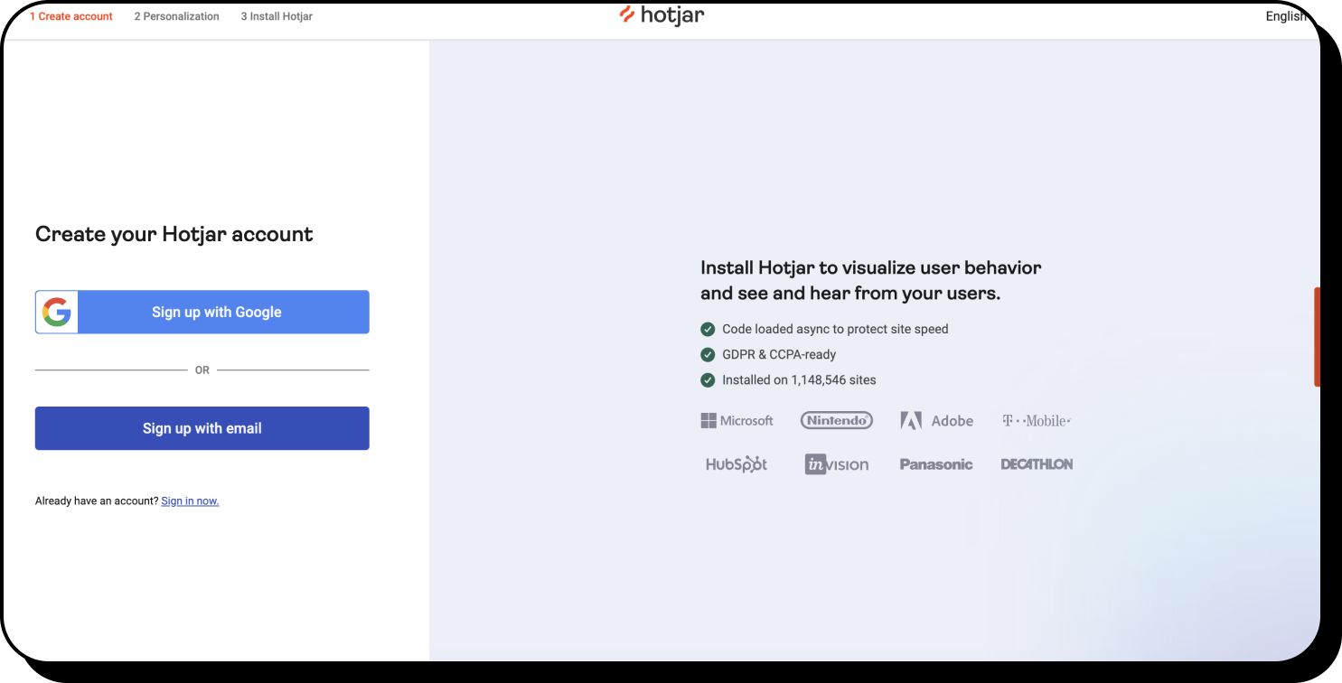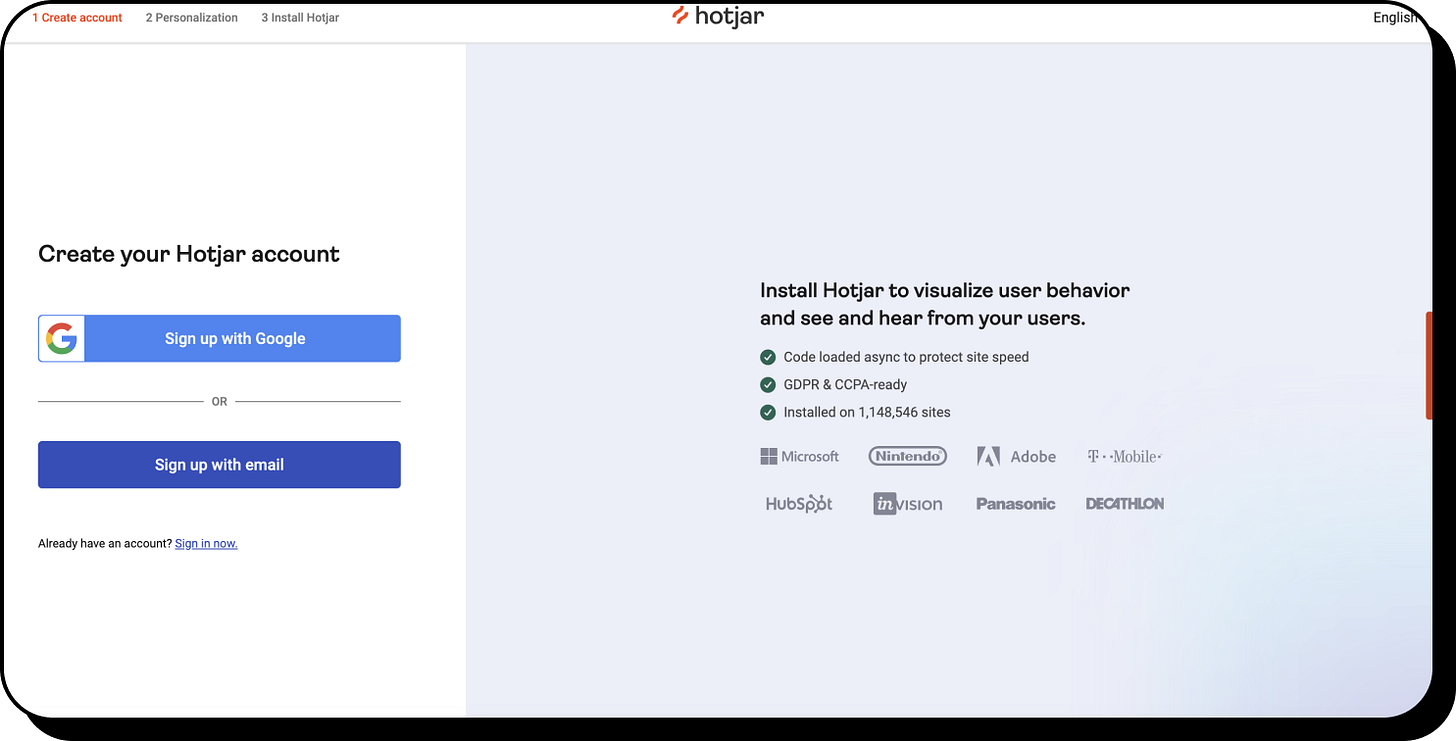 Hotjar also leverages some exciting numbers that show off how successful they are “Installed on 1,148,546 sites”