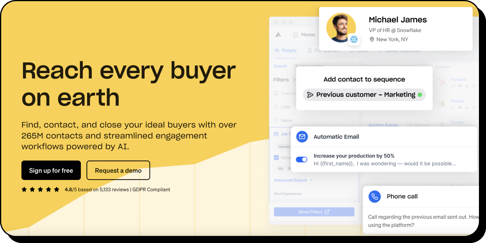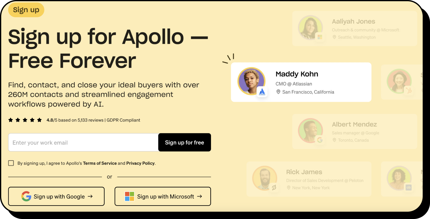 Apollo uses a slightly different approach - When you click “Sign up for free”, the page slightly changes into a form and Google/Microsoft sign up options. See the before and after below.