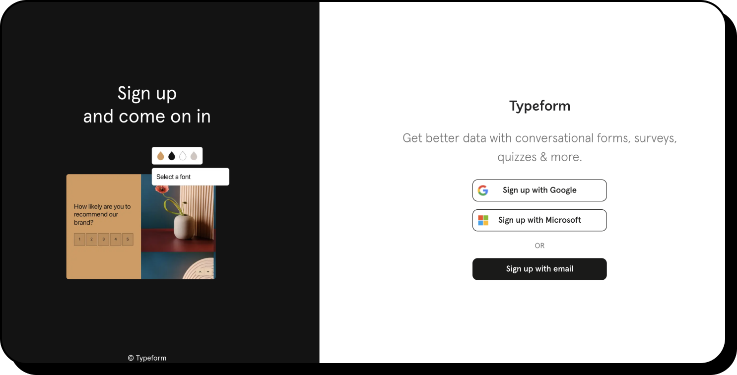 Another great way to excite users about your product is to show off what it can build. Typeform adds a minimal yet elegant design of an example question in a form. This helps users think, “Ooh I want to make something like that!”