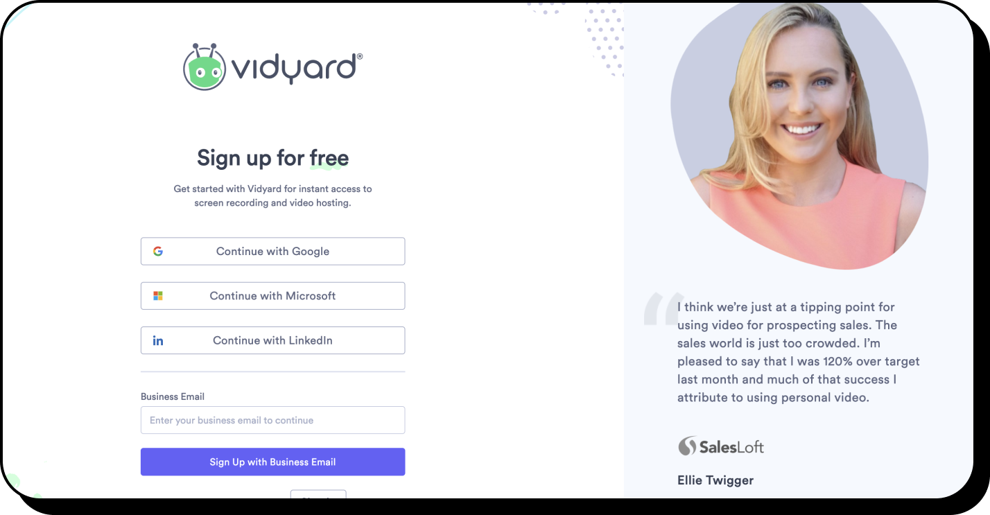 Vidyard: Share an exciting customer testimonial + Include a picture to humanize the entire experience. Nothing like a friendly face to start building trust with new users.