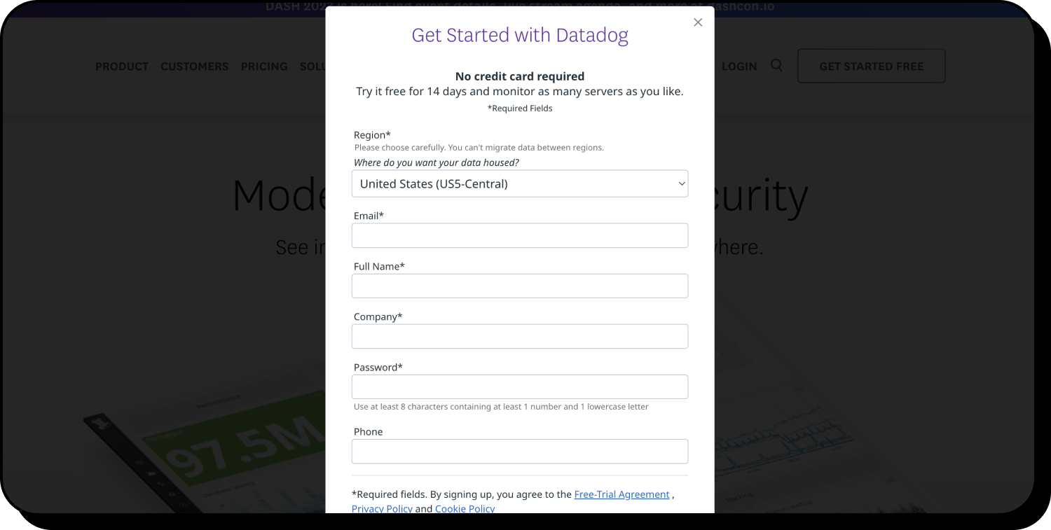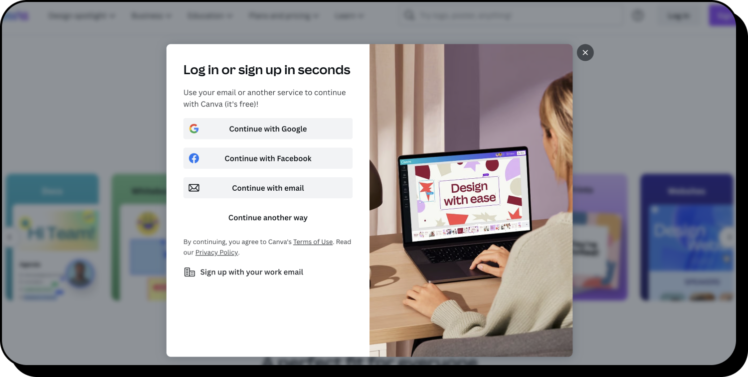 Canva, Figma, and Datadog, all have a simple pop up directly from their home-pages. It’s quick, easy, and allows users to still see/access all of the other content that you’ve spent a lot of thought and effort preparing for your home-page.