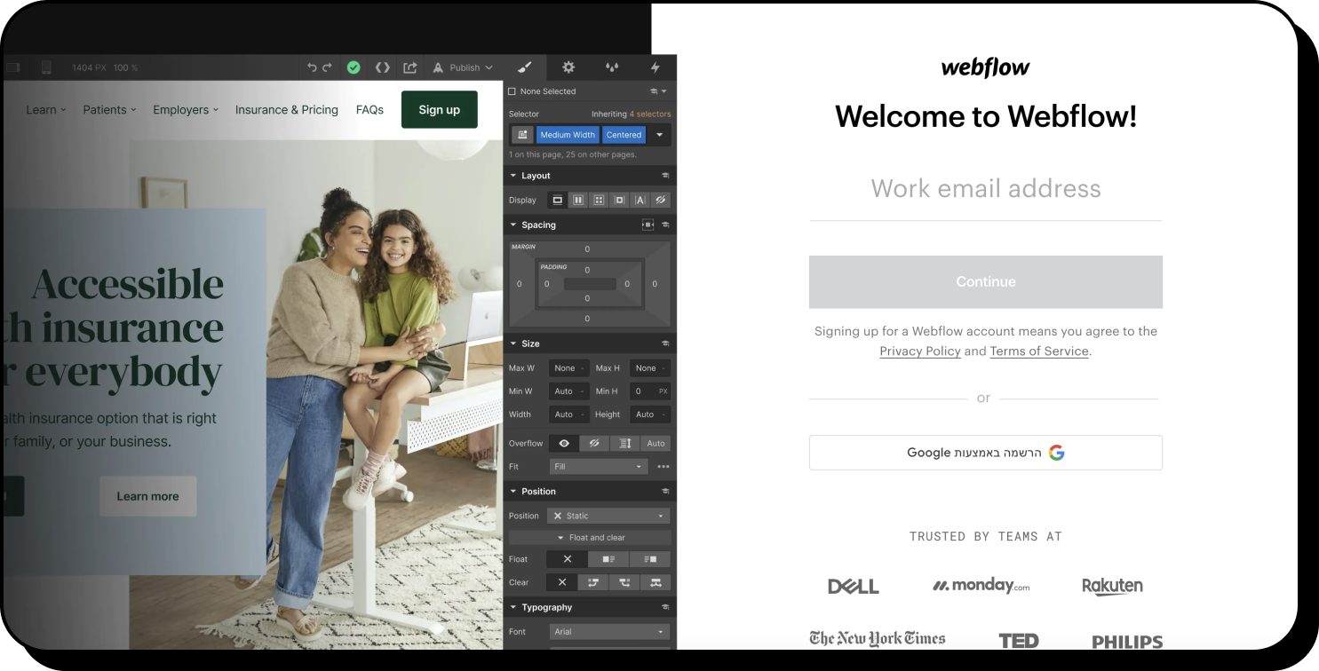 Webflow takes a similar approach but shows a side preview of the product in action instead.