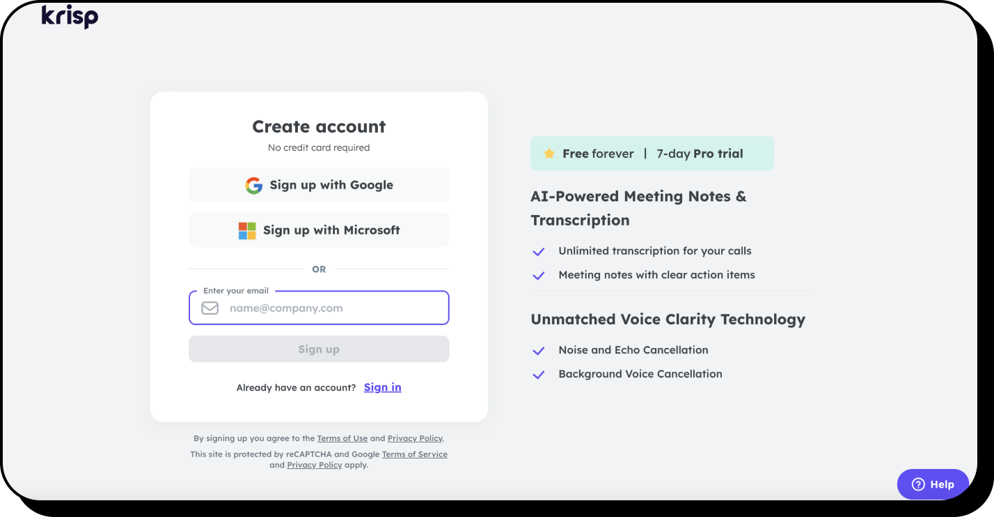 Help users understand the access they’re about to get. Krisp makes it easy to understand that they’ll be able to stay on the free plan, but for 7 days they’re also going to be able to access all Pro features - “Free forever | 7-day Pro trial”.